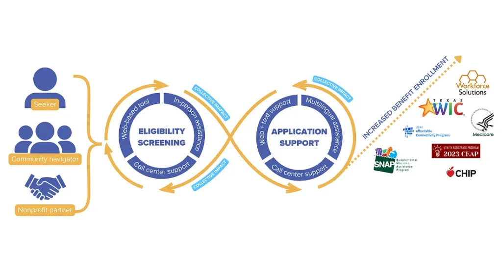 Community-based organizations, schools, and healthcare providers are well-poised to help families overcome these obstacles. However, public benefit programs are also difficult to navigate, and they operate without assistive tools to cut down on time and red tape. This causes the benefits enrollment gap to widen, putting our most vulnerable populations at risk — especially children and their families, those without reliable Internet access, and low-income Harris County renters.