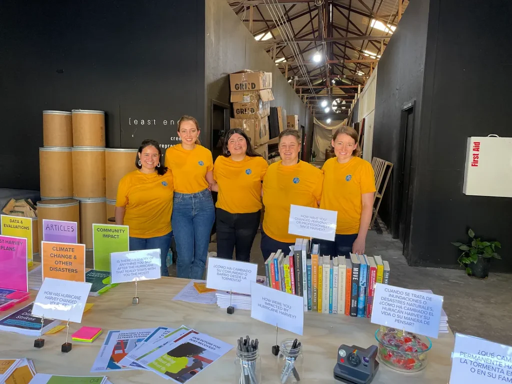 As part of our participation in the event, we created a “Hurricane Harvey Living Library,” a shared space for reflections on data, public reports, and disaster-related books. The curated collection included housing reports, community groups’ recommendations for recovery, human-centered design research about COVID-19, books on climate change and mitigation efforts, news articles about equitable (and non-equitable) disaster recovery efforts, and poems written by Harvey survivors.