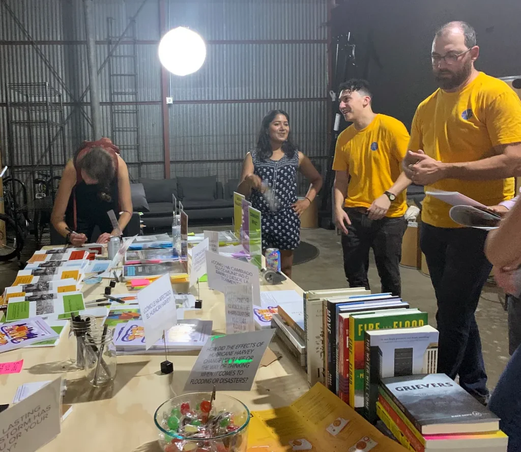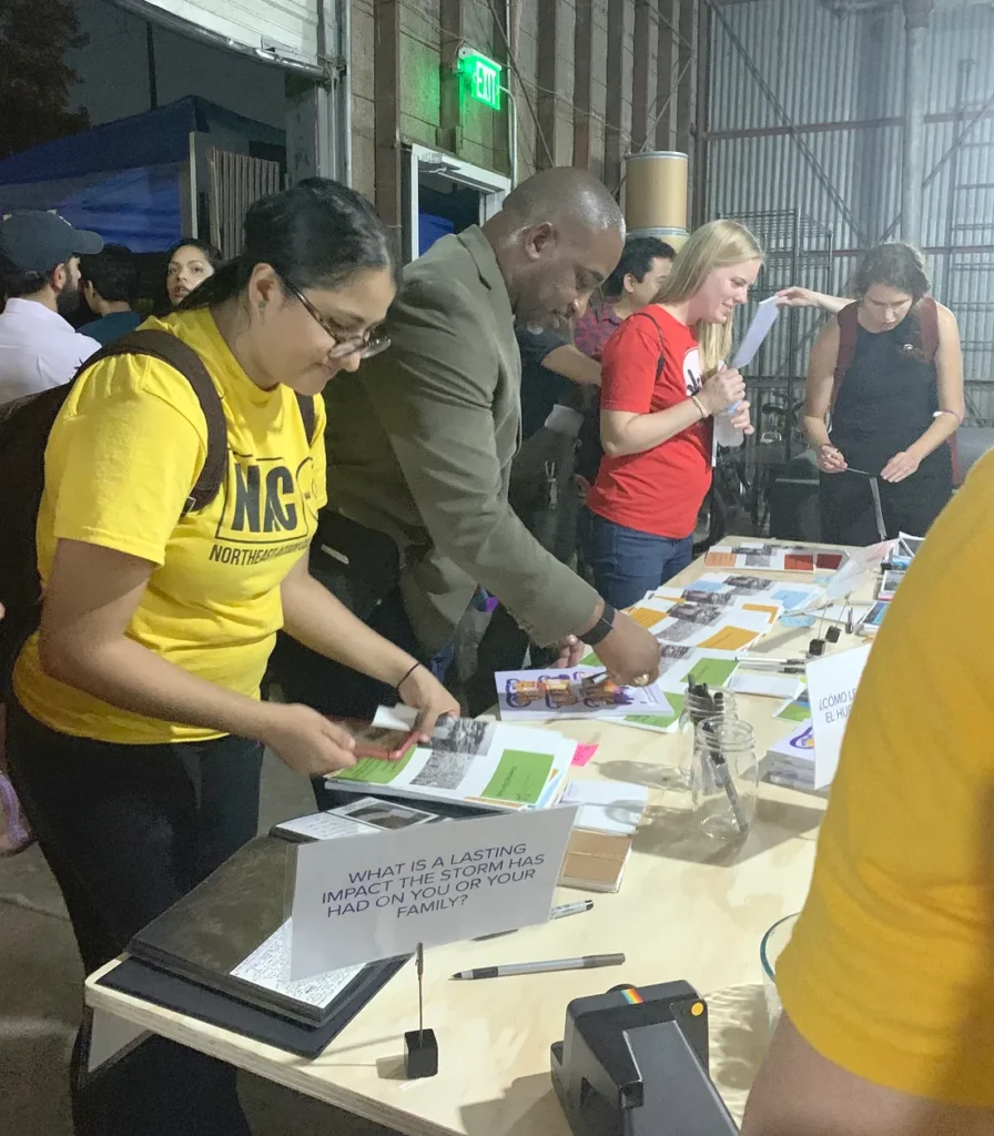 As attendees stopped by the Living Library, they were asked to help us create a book of Hurricane Harvey Stories, which will be displayed permanently at the Climate Justice Museum. Those who chose to document their stories answered one of the questions that were positioned along the table, like “How did Hurricane Harvey affect you?” or “What policies would you like to see implemented post-Harvey?” Then they placed their answer inside a photo album alongside a photo to commemorate their experience.