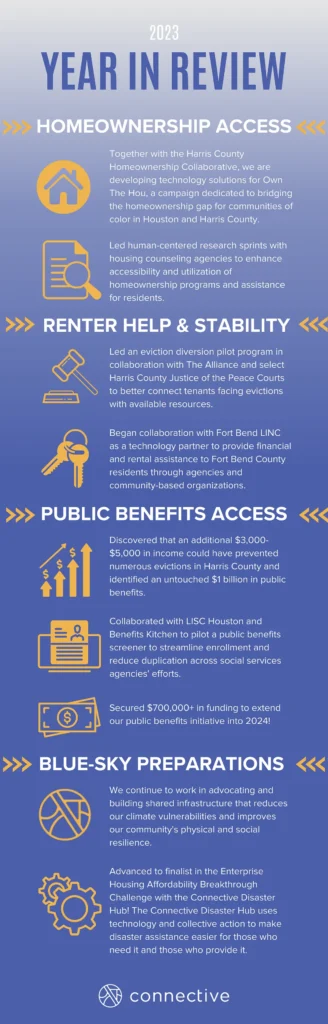 As we lift our heads from disaster response, Connective has deepened our design and advisory services for nonprofits and public sector partners this year. From human-centered research sprints focused on the experiences and needs of home-based childcare providers in Harris County to design and technology consulting services on area utility assistance programs and youth mental health services, we look forward to continuing to transform the delivery of social services during disasters and everyday life.
