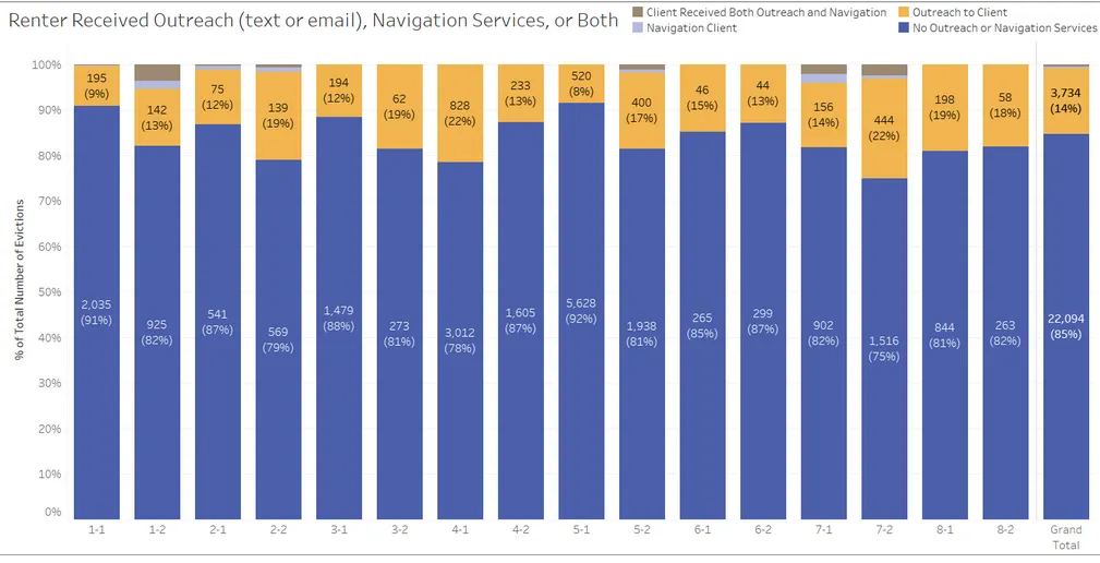 Some tenants may choose to self-evict at this point to avoid the stress of the court process or because they have a limited understanding of their rights or what they should bring to court. During this pilot, we scraped eviction docket data to perform targeted outreach via email and text up to a week before the filed court date. The messages included helpful reminders about the importance of showing up for court, legal aid information, what to bring to court, information on tenant rights, and more. Fifteen percent of tenants on the eviction docket were contacted, and those who received this outreach had a 38% reduction in default judgments. (Figure 1.)