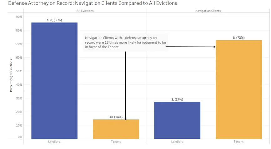 Navigation clients were also much more likely to appeal and win their cases. They were two times more likely to appeal their judgments– and have representation from a defense attorney. Both appeals and representation increased the possibility of favorable case outcomes– navigation clients with a defense attorney on the record were 13 times more likely to have their eviction case ruled in their favor. (Figure 3.)