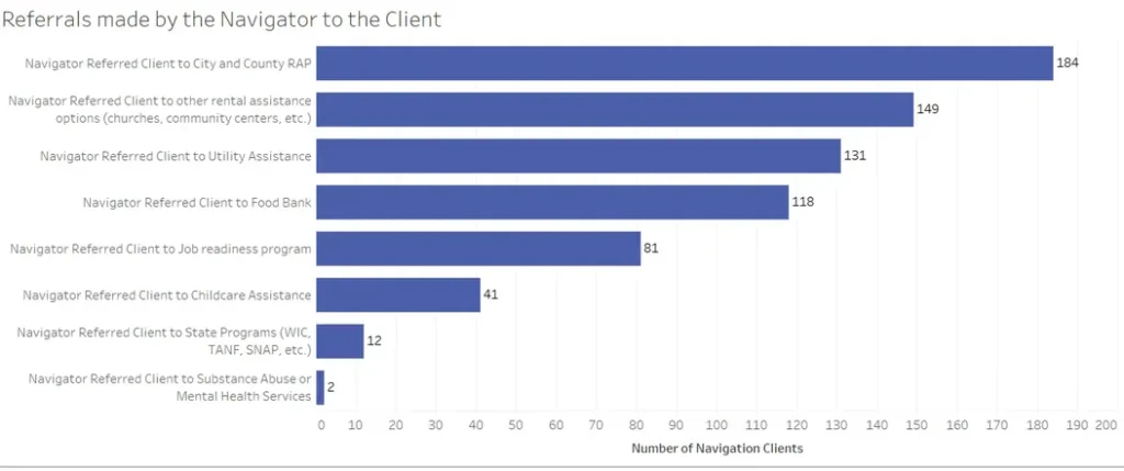 Warm referrals worked well for the navigators– they referred 75% of cases to the Houston-Harris County Emergency Rental Assistance Program. (Figure 2.) In a post-pilot survey, navigators named rental assistance as their most valuable resource tool, as more than 20% of ERAP applications originated from in-court navigators.